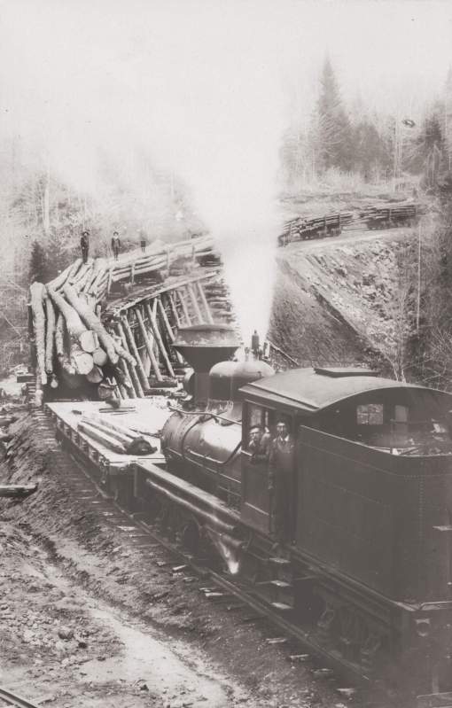 This train ascends the Woodstock and Thornton Logging Railroad full of loggers…: