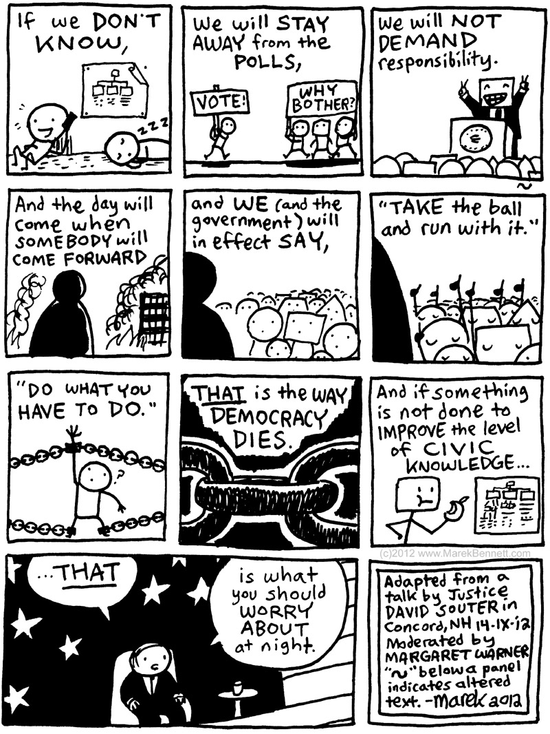 Note that I’m not really trying to draw “Souter” (the person) here, at least not in the documentary sense. Β Rather, I’m drawing out my interpretation of his words through cartoony ideas & characters… Β But hopefully they’ll help us get at Souter’s message, which I found at once sobering and inspiring.