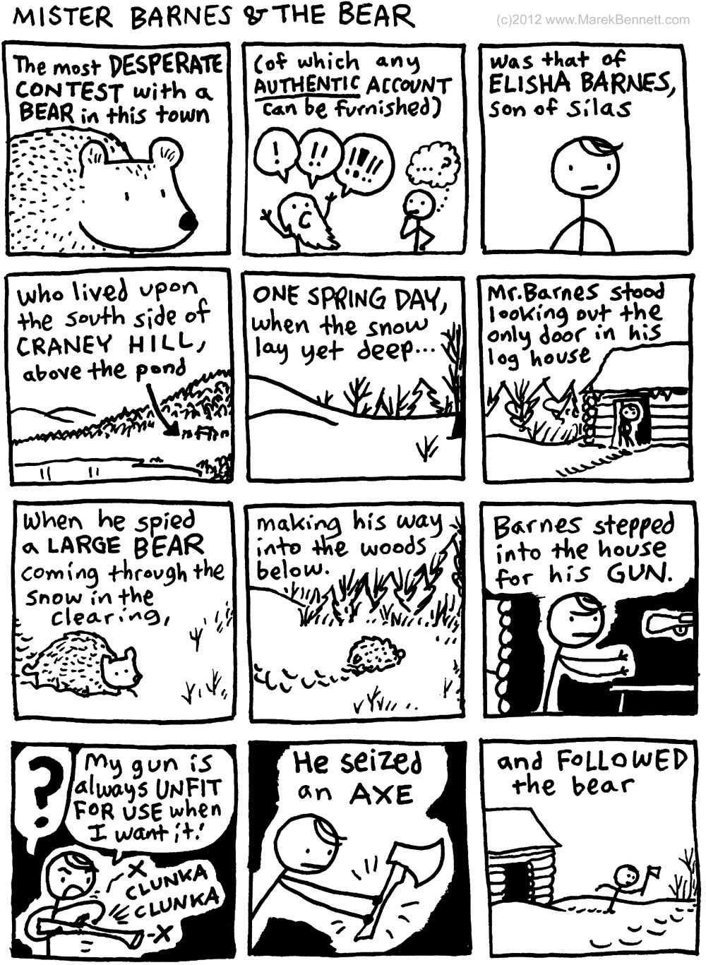 Interestingly enough, this is NOT the only NH hunting story I’ve come across where the hapless hunter saves himself by reaching down the bear’s throat and grabbing its tongue. This must have been common practice during colonial bear attacks. So why is it not part of NH Fish & Game’s “Learn to Live with Bears” tips nowadays?