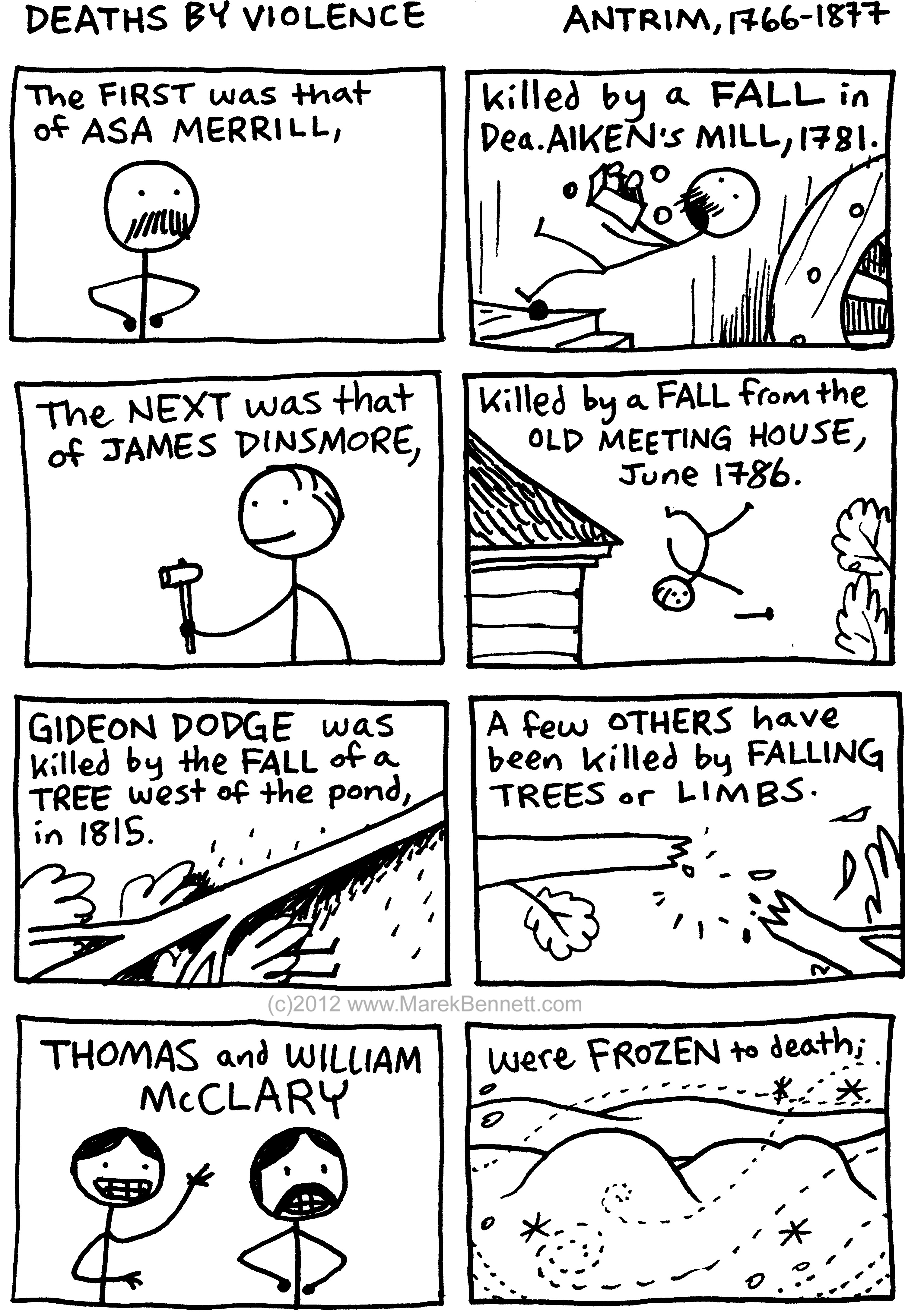 Here’s a look at fatalities during the early days of Antrim, NH: << BEFORE: More deaths in Weare. MORE: Death in general… >> Share this: Click to share on Facebook (Opens in new window) Facebook Click to share on X (Opens in new window) X Click to share on Reddit (Opens in new window) Reddit Click to share on Pinterest (Opens in new window) Pinterest Click to email a link to a friend (Opens in new window) Email Click to print (Opens in new window) Print Like Loading... Related Published by Marek Cartoonist, musician, teacher. View all posts by Marek