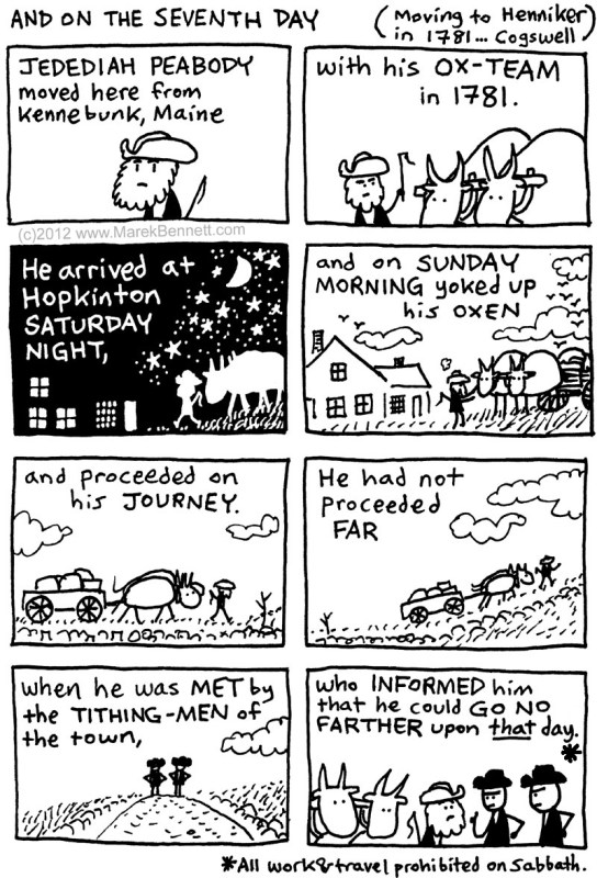 Mr. Peabody just wants to drive his oxen from Maine to his new home in Henniker, NH… Share this: Click to share on Facebook (Opens in new window) Facebook Click to share on X (Opens in new window) X Click to share on Reddit (Opens in new window) Reddit Click to share on Pinterest (Opens in new window) Pinterest Click to email a link to a friend (Opens in new window) Email Click to print (Opens in new window) Print Like Loading... Related Published by Marek Cartoonist, musician, teacher. View all posts by Marek
