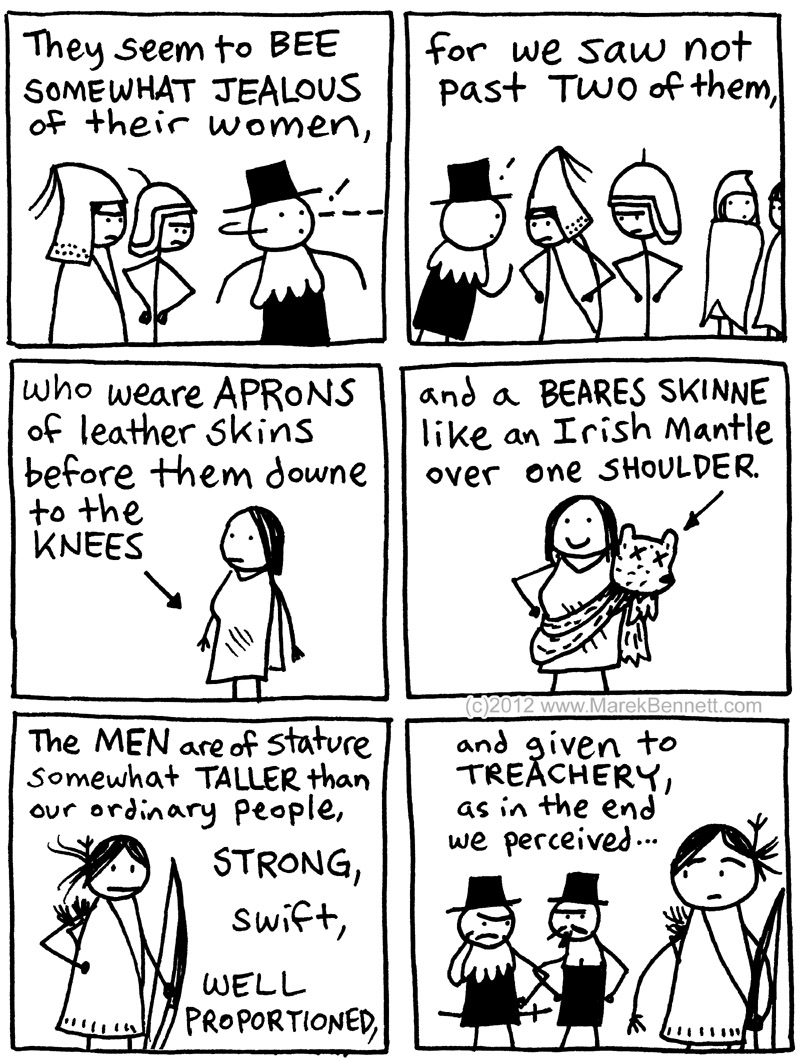 Native fashions of the 17th century, for men and women … << BEFORE:Β “Let loose the Mastives” From the JOURNAL OF MARTIN PRING (1603): NEXT: canoes >> Share this: Click to share on Facebook (Opens in new window) Facebook Click to share on X (Opens in new window) X Click to share on Reddit (Opens in new window) Reddit Click to share on Pinterest (Opens in new window) Pinterest Click to email a link to a friend (Opens in new window) Email Click to print (Opens in new window) Print Like Loading... Related Published by Marek Cartoonist, musician, teacher. View all posts by Marek