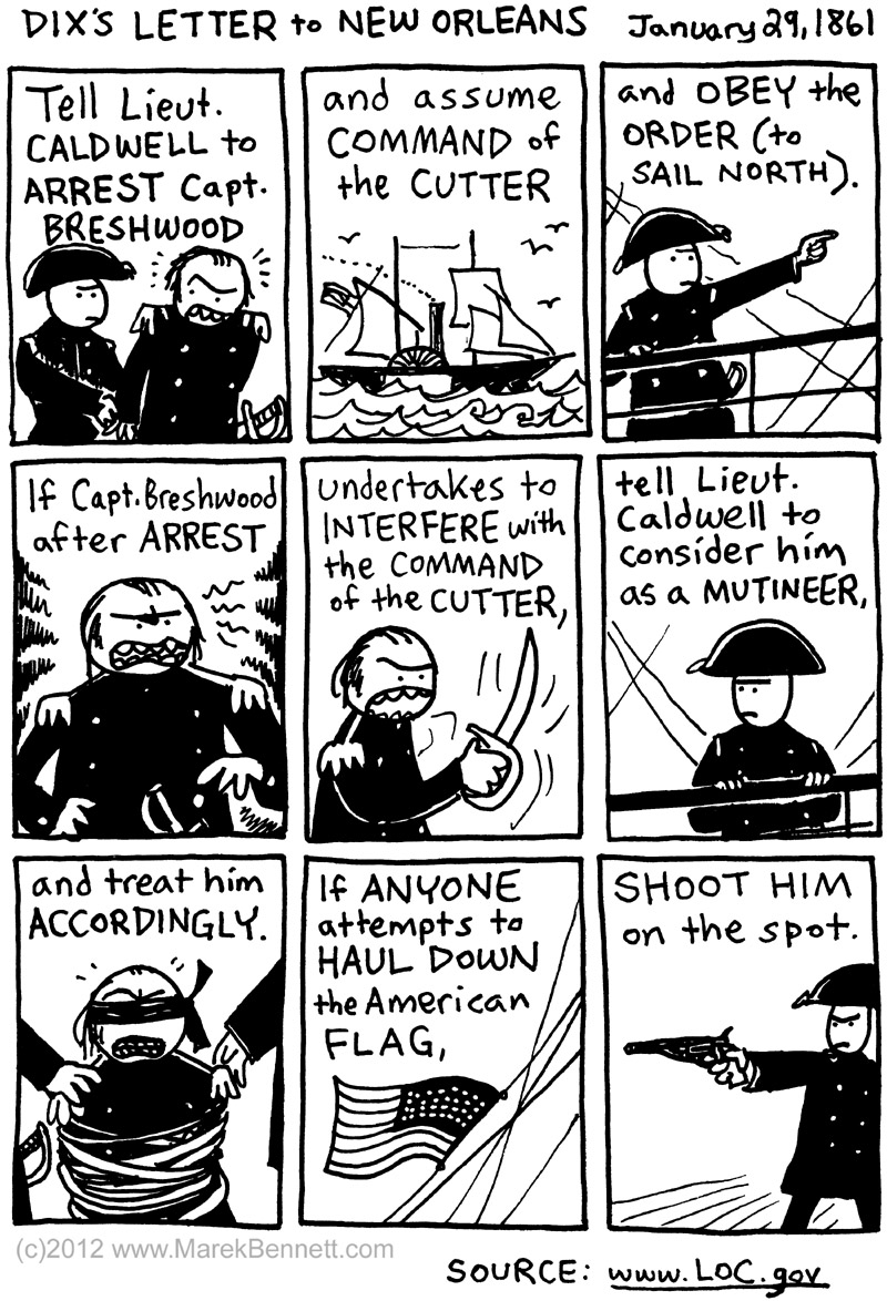 As the union begins to crumble, Treasury Secretary Dix orders a revenue cutter in New Orleans back North; the captain refuses, and Dix sends this telegram to his agent in the South: