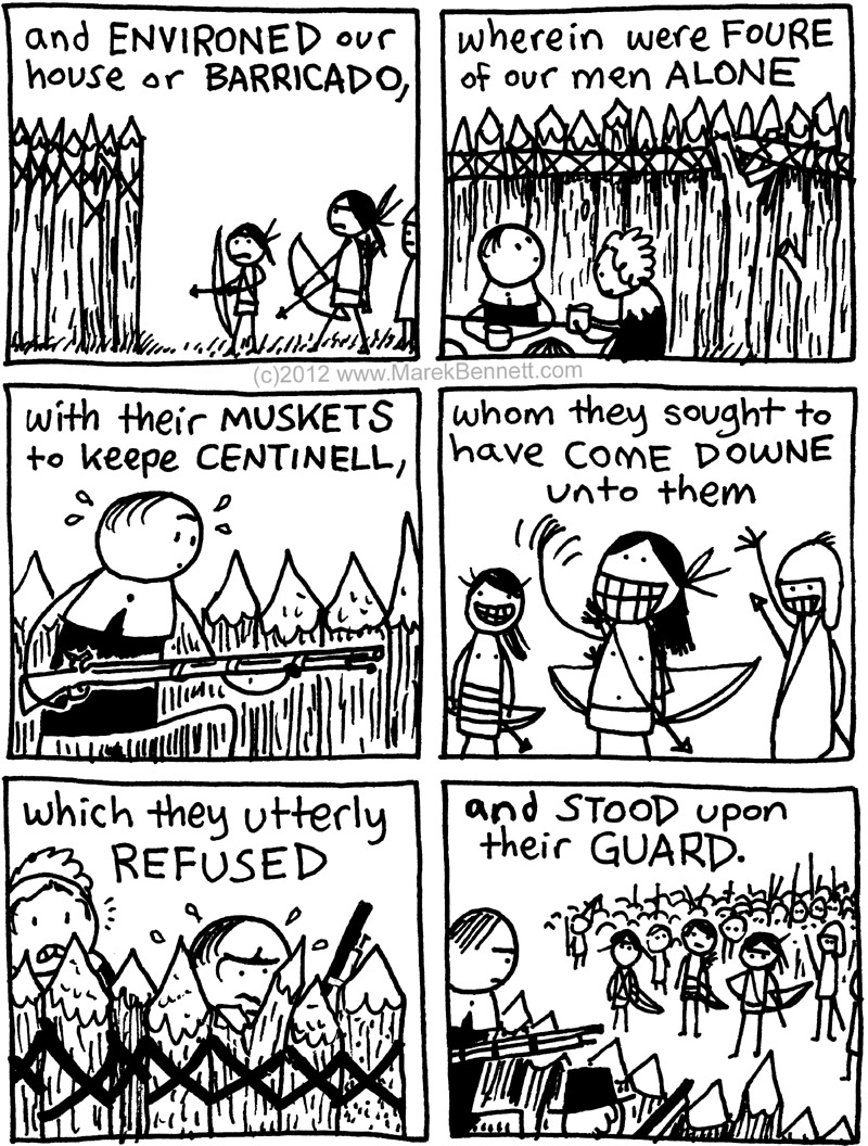 Pring’s men have now spent several weeks harvesting as much valuable sassafras as they possibly can, so that they can send “speedie contentment” to their investors back in England. Suddenly, the natives seem to have soured on these profit-minded guests. Alas! Do you remember how joyfully this whole encounter started out?