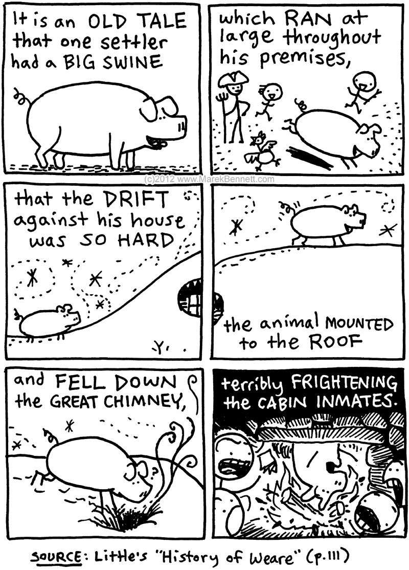 One settler family receives a surprise visitor during a particularly harsh winter in early Weare… NEXT: The only way to travel >> Share this: Click to share on Facebook (Opens in new window) Facebook Click to share on X (Opens in new window) X Click to share on Reddit (Opens in new window) Reddit Click to share on Pinterest (Opens in new window) Pinterest Click to email a link to a friend (Opens in new window) Email Click to print (Opens in new window) Print Like Loading... Related Published by Marek Cartoonist, musician, teacher. View all posts by Marek