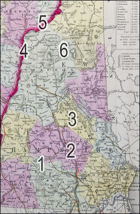 We can trace Swett’s roundabout journey to the White Mountains by his anecdotes on this colorful 1852 map of NH & VT: