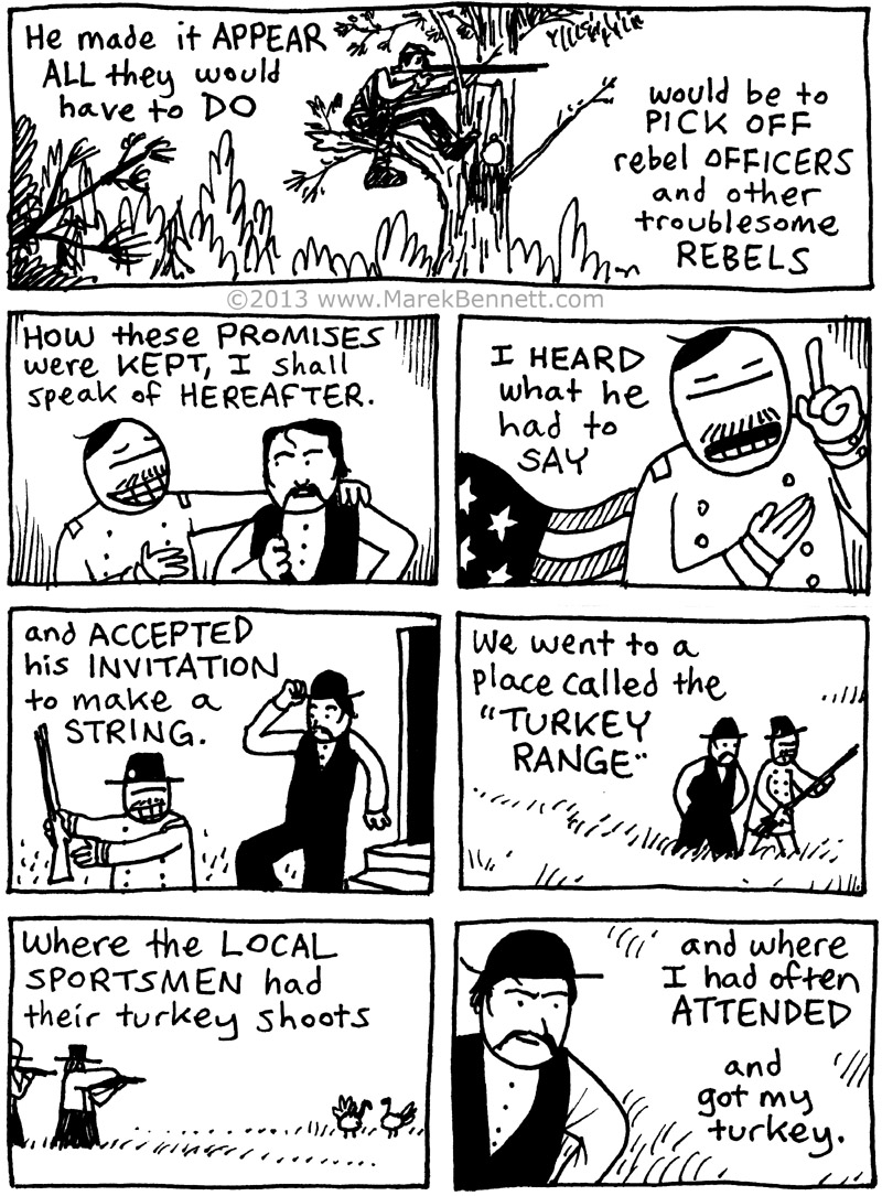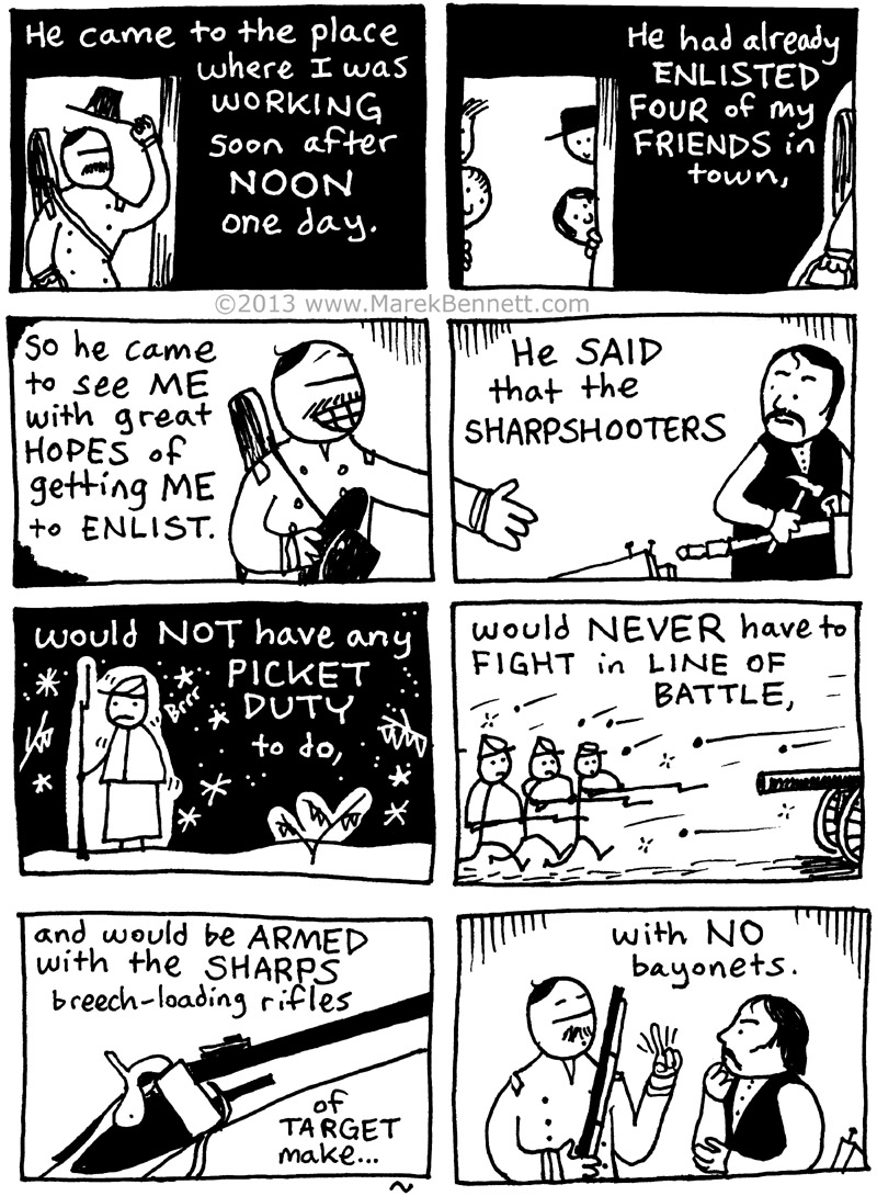 Homer’s engraving of “The Sharpshooter” inspired the top panel of page 003. At this time in the war, sharpshooters with long-range rifles presented a dramatic evolution in warfare — anonymous instant death without warning, from an unseen enemy! (Some historians and journalists connect the effect of sharpshooters on their targets with that of drones in modern battlezones.)