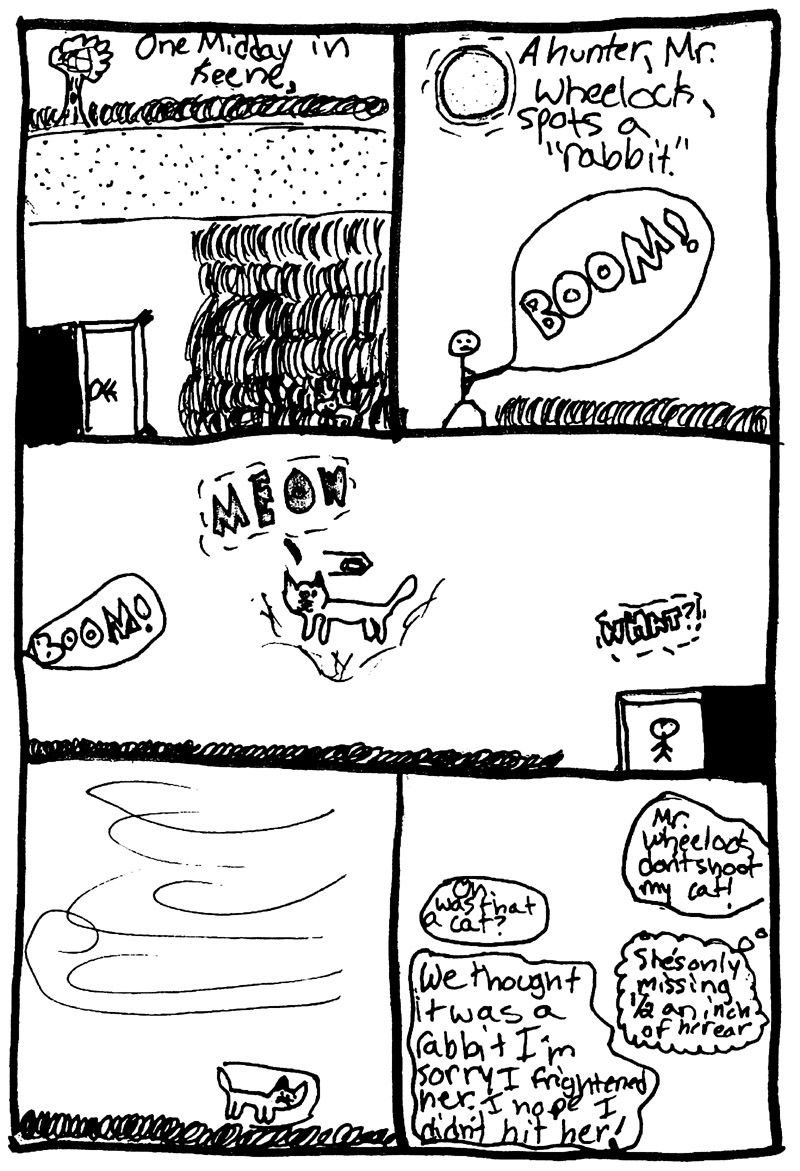 Here’s a double-header of a favorite hunting anecdote from Keene, as drawn in two distinct styles by guest artists Jett L. and Lauren H. at a recent KPL Family Comics Workshop: