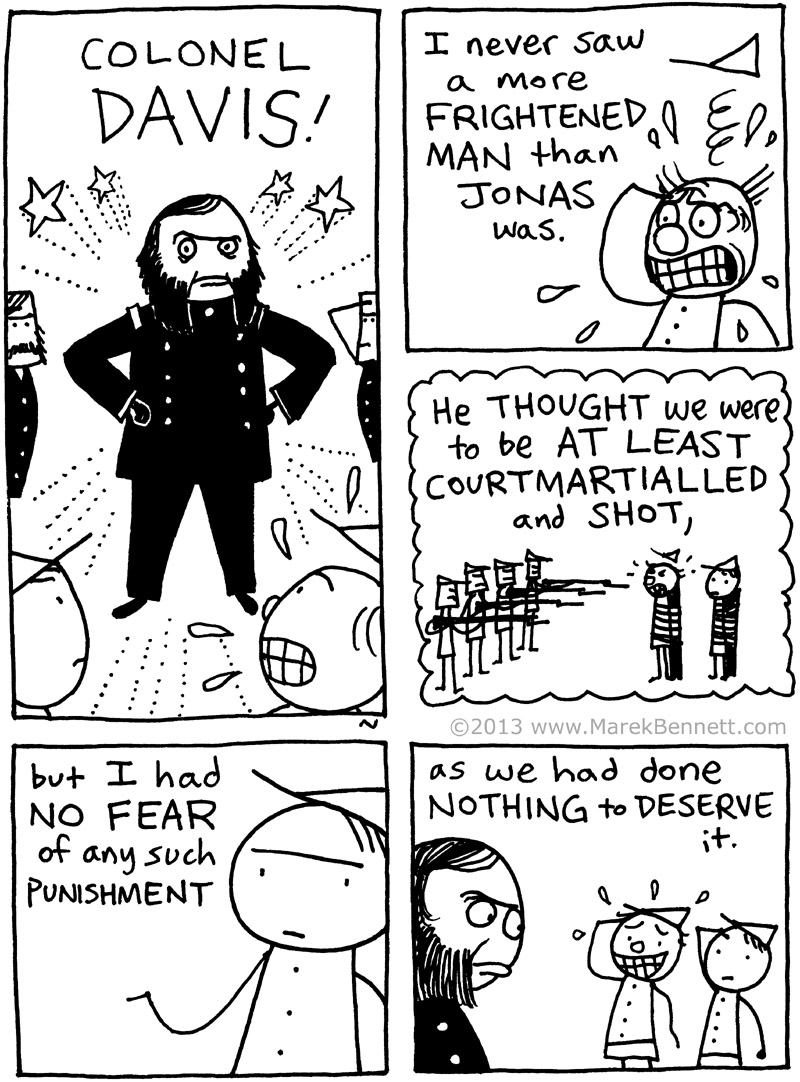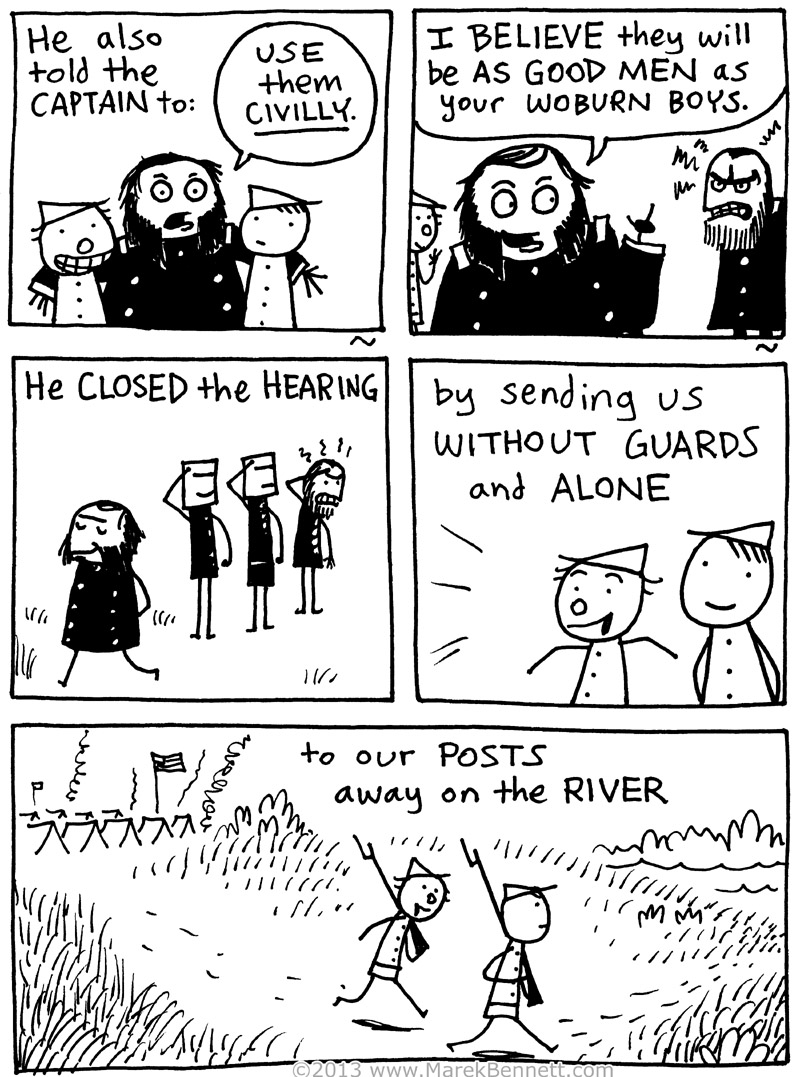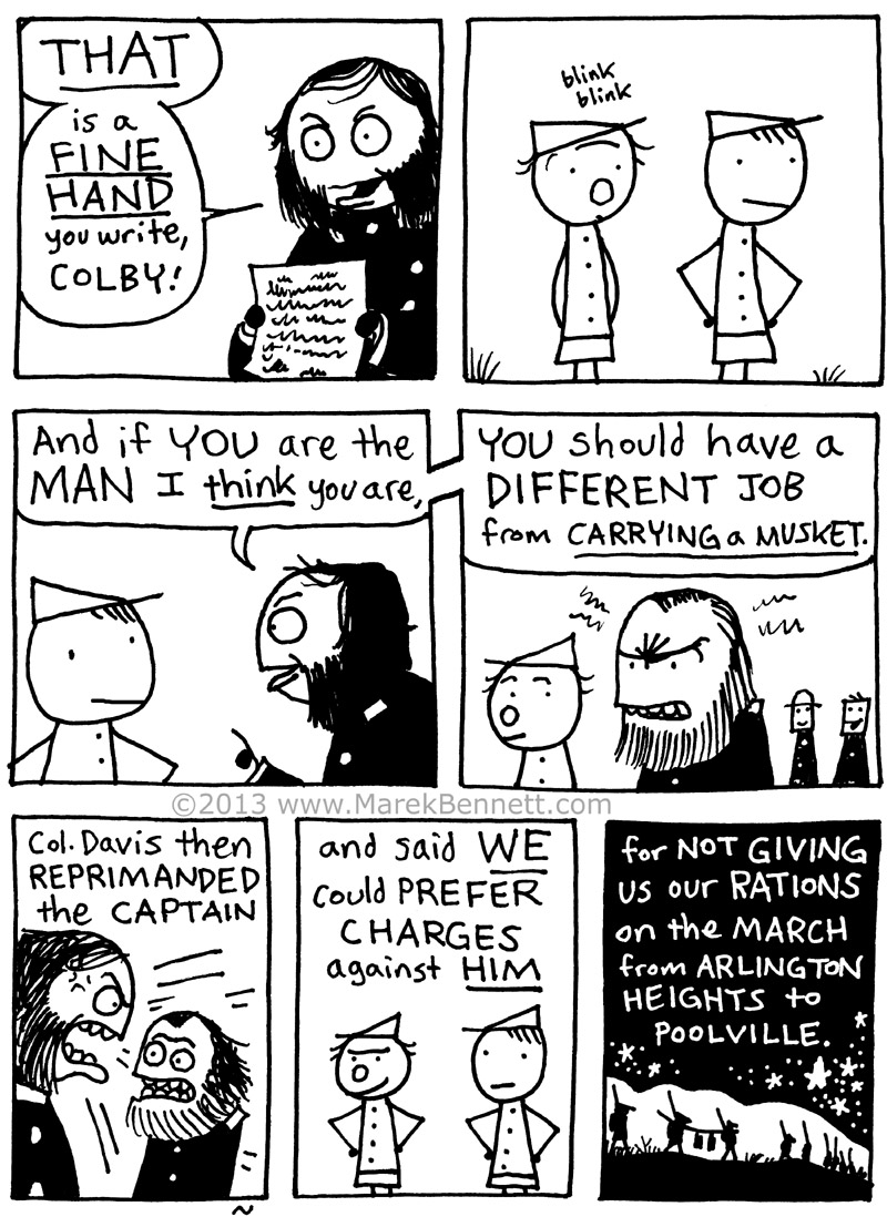 1862: Freeman & Jonas finally get to plead their case regarding their dramatic escape from camp … Civil War Diary of Freeman Colby (continued): << BEFORE: Day of Rest … NEXT: Hate & Duty >> 39.145939 -77.416931 Share this: Click to share on Facebook (Opens in new window) Facebook Click to share on X (Opens in new window) X Click to share on Reddit (Opens in new window) Reddit Click to share on Pinterest (Opens in new window) Pinterest Click to email a link to a friend (Opens in new window) Email Click to print (Opens in new window) Print Like Loading... Related Published by Marek Cartoonist, musician, teacher. View all posts by Marek