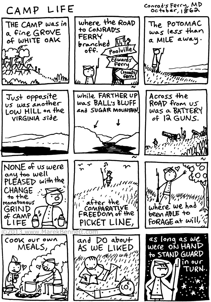 1862: Camp life is definitely a step down from picket duty … Civil War Diary of Freeman Colbyย (continued): << BEFORE: Alarm!ย … NEXT: Camp schedule >> 0.000000 0.000000 Share this: Click to share on Facebook (Opens in new window) Facebook Click to share on X (Opens in new window) X Click to share on Reddit (Opens in new window) Reddit Click to share on Pinterest (Opens in new window) Pinterest Click to email a link to a friend (Opens in new window) Email Click to print (Opens in new window) Print Like Loading... Related Published by Marek Cartoonist, musician, teacher. View all posts by Marek