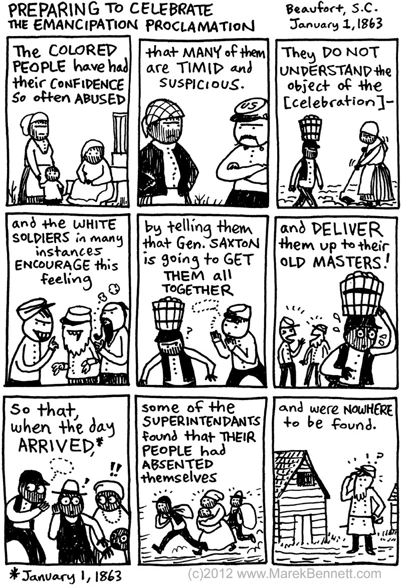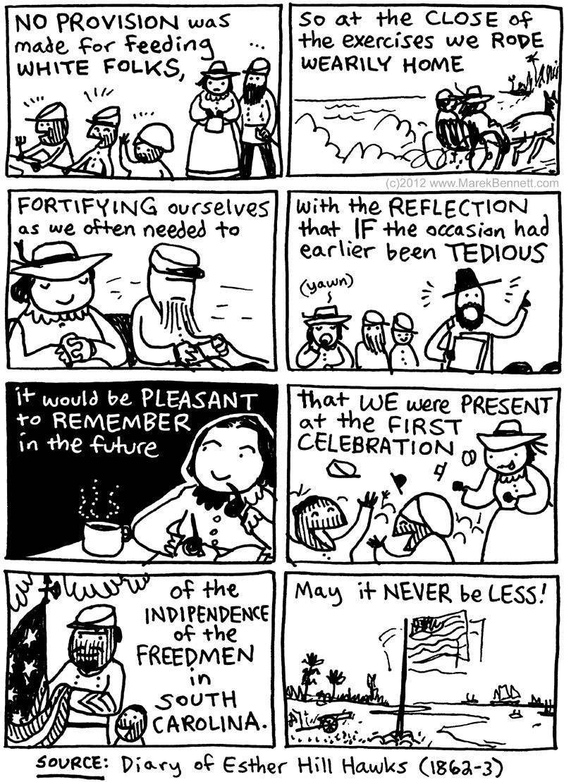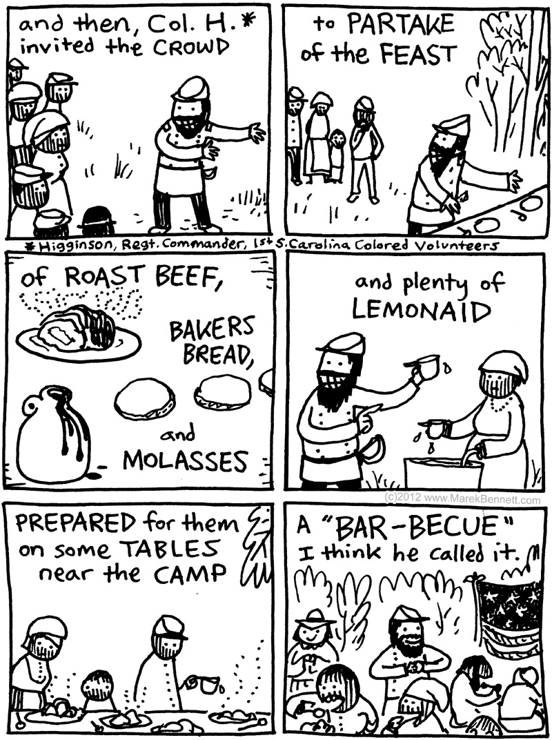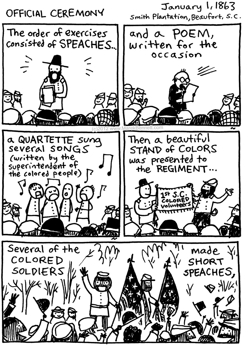I’ve based the panel of the “colored soldiers” making “short speaches” on the drawing “Emancipation Day in South Carolina” at the Library of Congress: