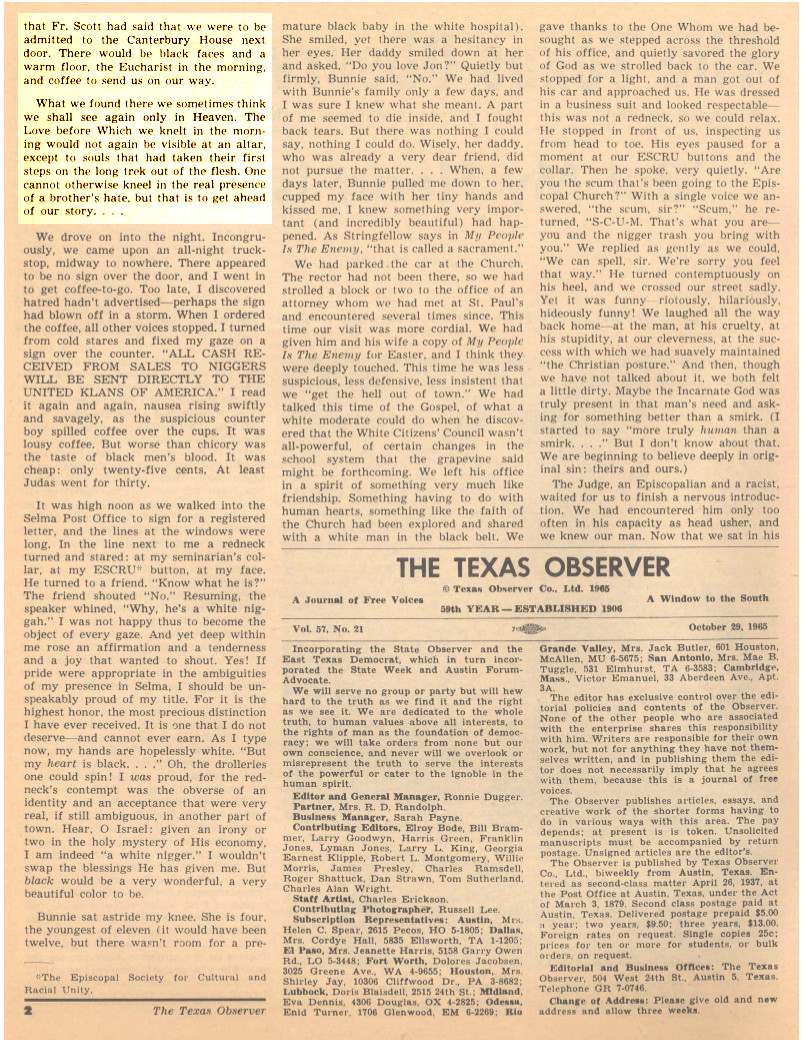 - “But My Heart is Black” by Jonathan Daniels (published posthumously in The Texas Observer, 1965)
