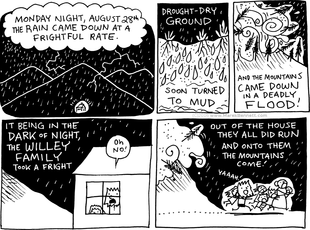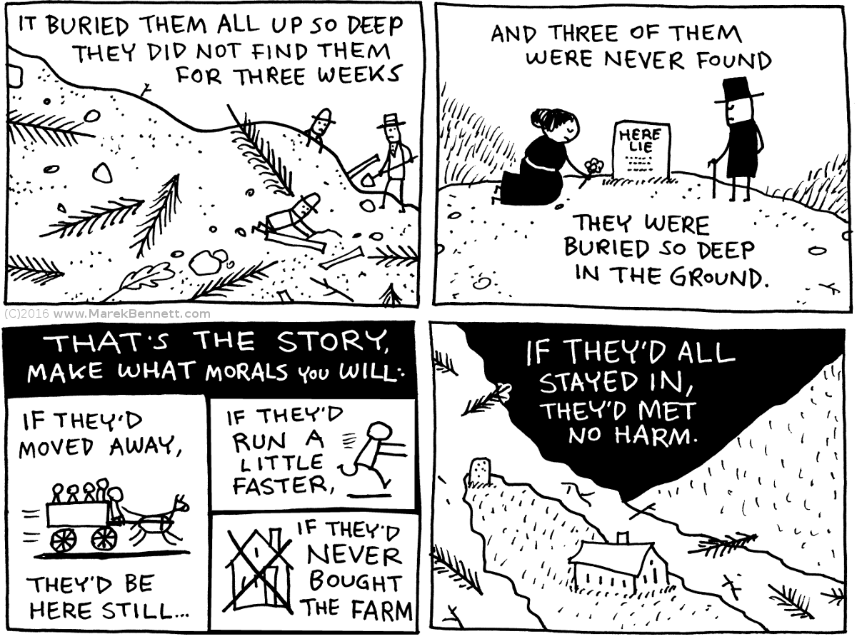 I use Leavitt’s 1885 version (where the mudslide “hit” the barn, instead of “took” it — “hit” is more clear for a modern audience). - More about Leavitt’s poetry: “Franklin Leavitt’s White Mountains Verse” by David Tatham >>