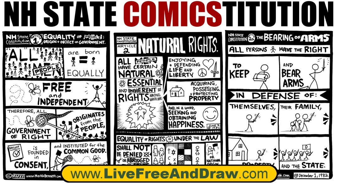 The NH State Constitution contains many important, interesting, and intriguing ideas that form the foundation of our state government… but for some reason, very few people ever take the time to read it! So here’s the official LIVE FREE AND DRAW comics adaptation — a “Comicstitution” — to help draw out its meaning: