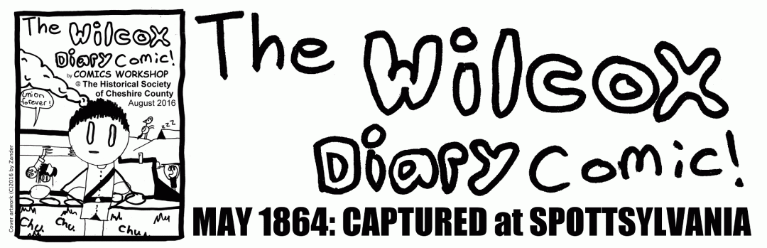 Wilcox & Co. do their best to survive as prisoners backstage at one of the war’s major battles… Drawn by guest artistΒ SammyΒ duringΒ COMICS CAMP at the Historical Society of Cheshire County: from the Civil War Diary of Charles W. Wilcox |<Β <<Β 13-14 MayΒ 1864 >> SOURCES: SammyΒ draws from Wilcox’s diary entries for 13-14 May: … & from theβ¦
