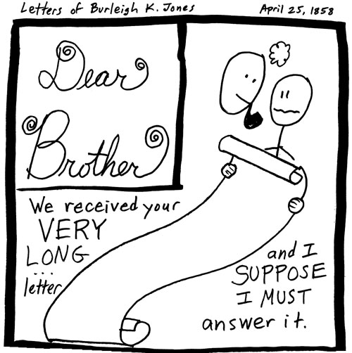 1855: Contoocook's Burleigh K. Jones shares news from home (and demonstrates his sense of humor) in an exciting letter to his brother Sullivan. (Drawn by guest artist Andrew Z.) ...